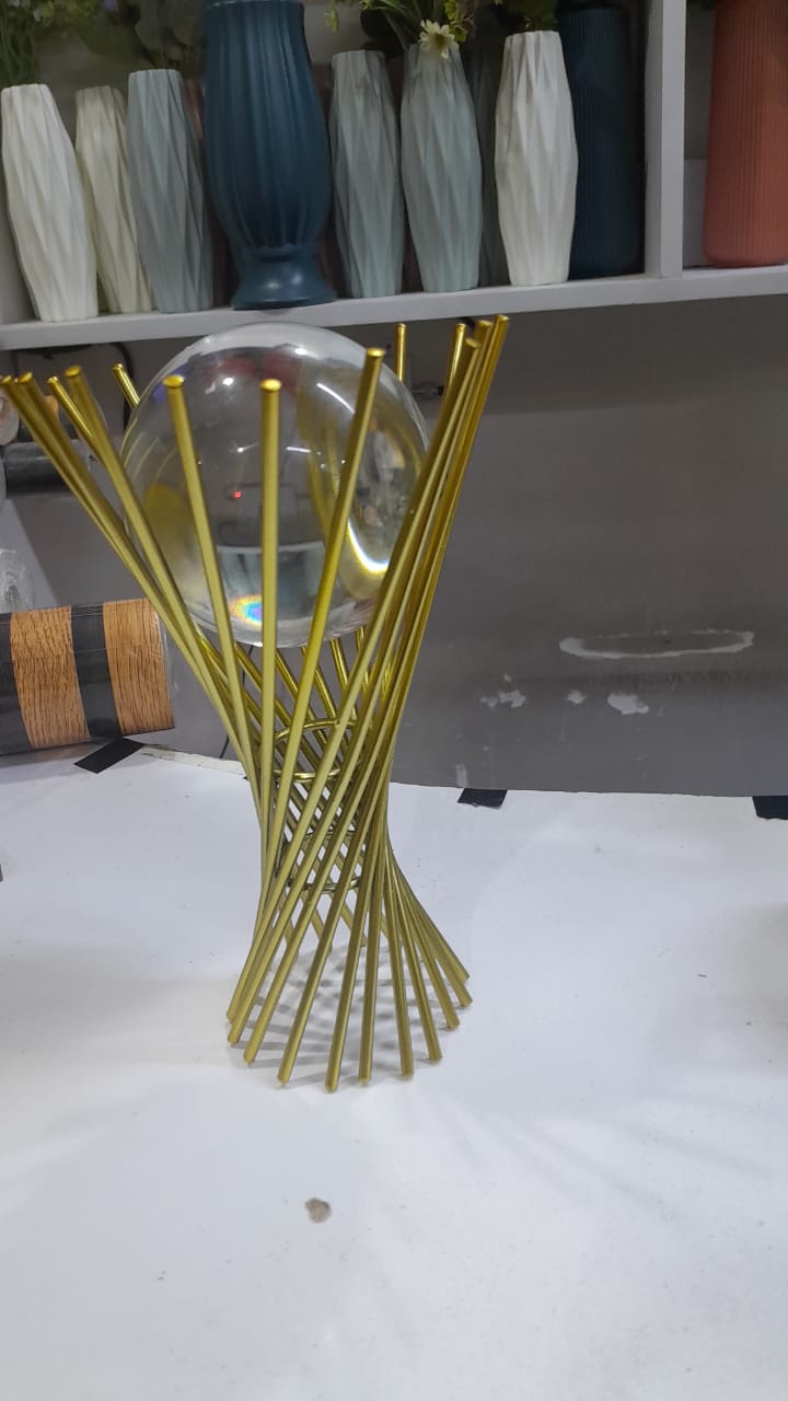 Elevate your space with this stunning Modern Gold Orb Sculpture, a true statement piece that blends artistic design with luxurious style. Featuring a clear crystal sphere suspended within a dynamic swirl of golden metal rods, this sculpture symbolizes balance, motion, and modern sophistication.