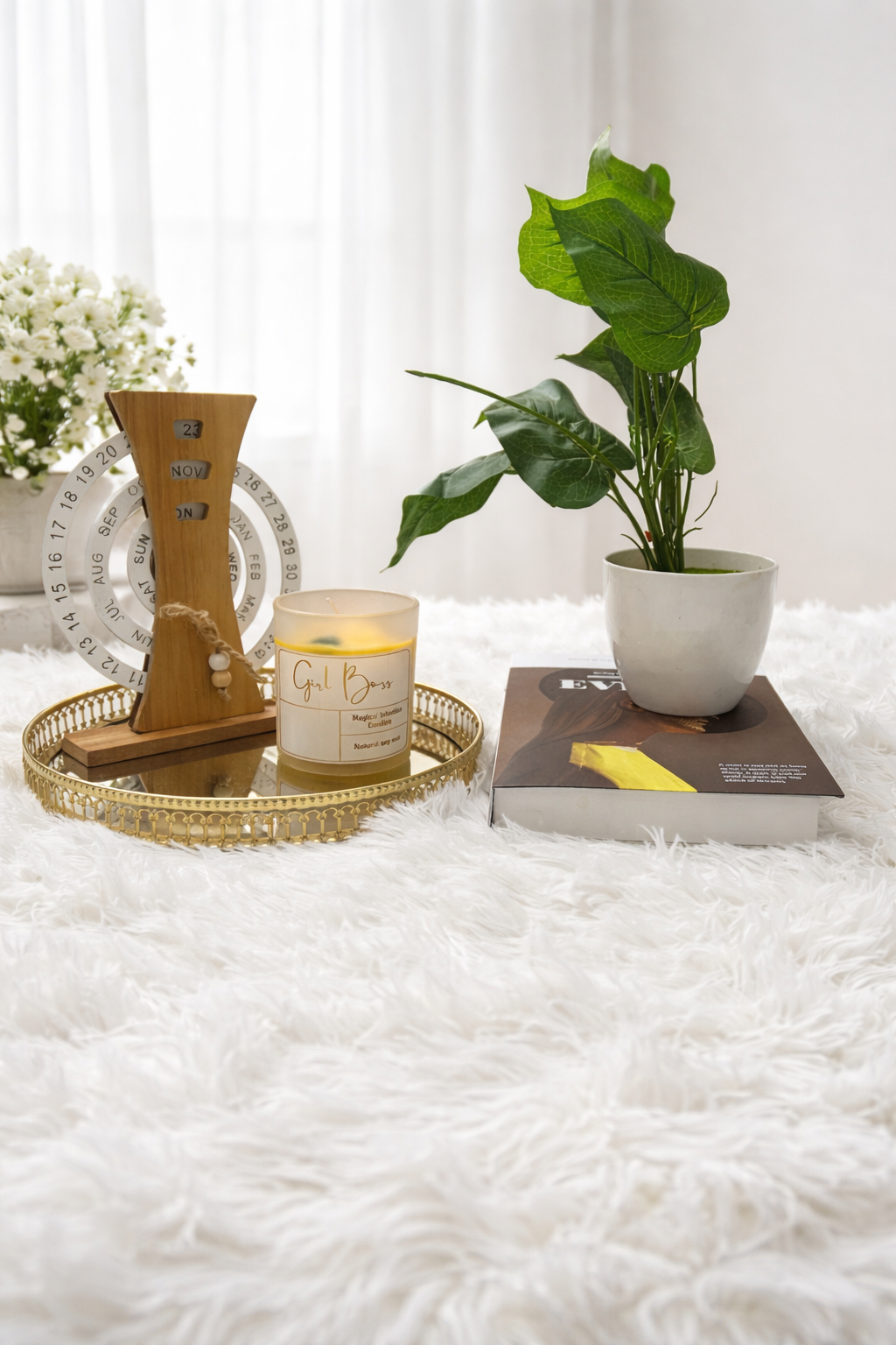 A chic and elegant decor set featuring a scented candle on a gold mirrored tray, a wooden perpetual calendar, a minimalist decor book, and a potted artificial plant. Perfect for adding a modern, luxurious touch to any space—ideal for homes, offices, Airbnb styling, or gifting. ✨